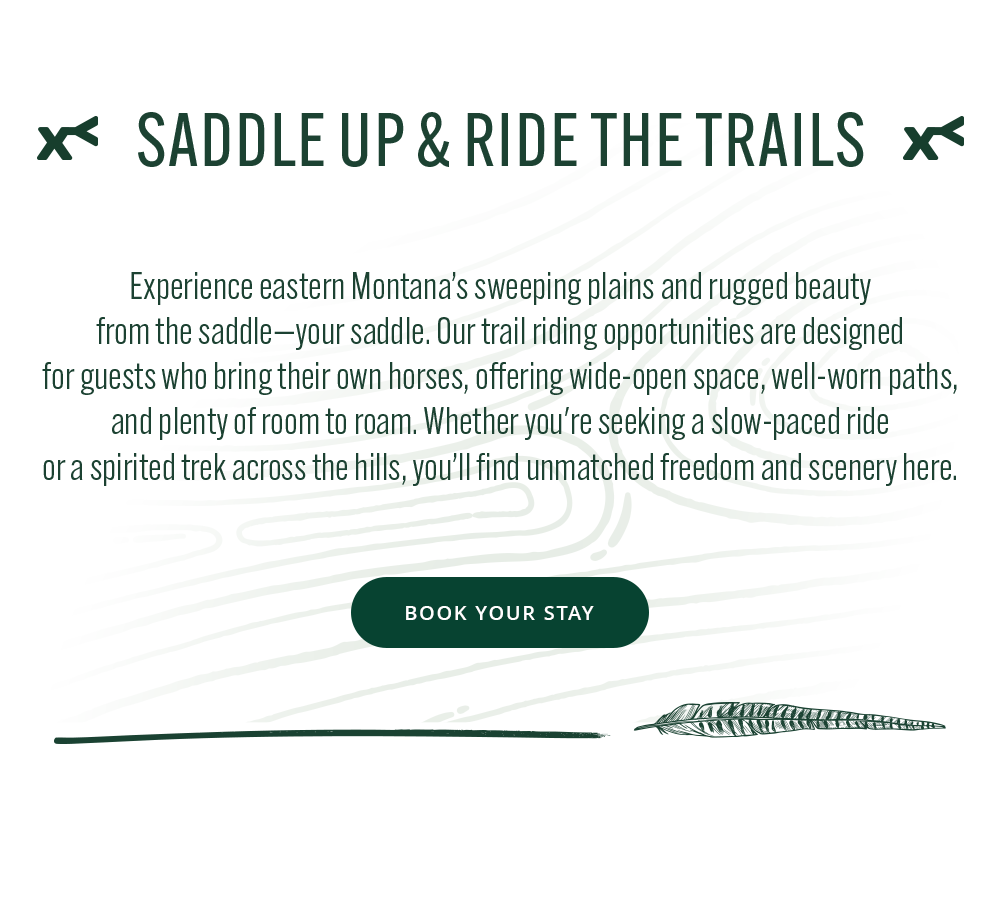 Trail riding is available from late spring through early fall, depending on weather and ground conditions. Bringing your own horse is optional, and we recommend booking ahead to ensure trail access and proper accommodations.